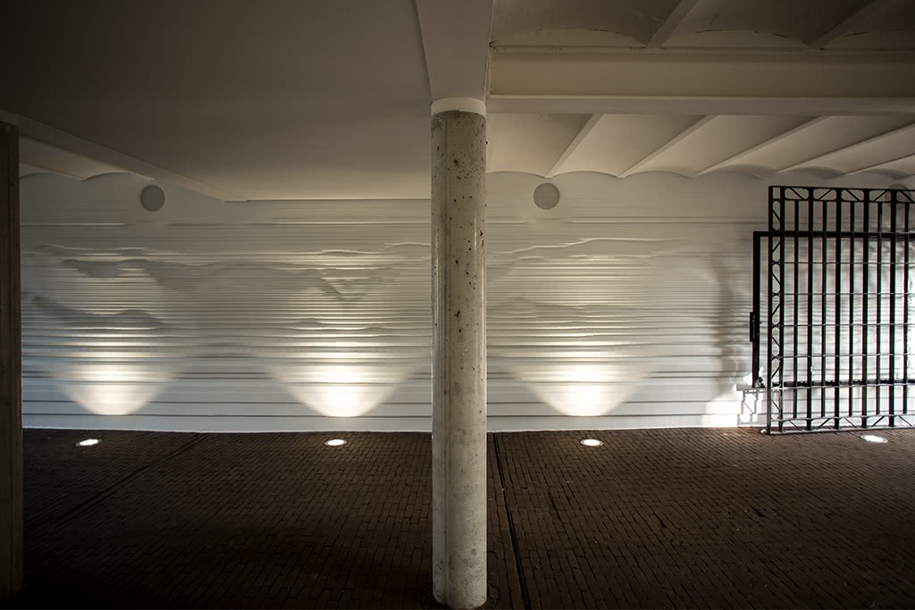 The artwork consists of a wall relief of 12.5 by 2.5 meters and an 8-channel generative sound composition. The composition creates a continuum between noise and human voice which results in moments when wind seems to be whispering.