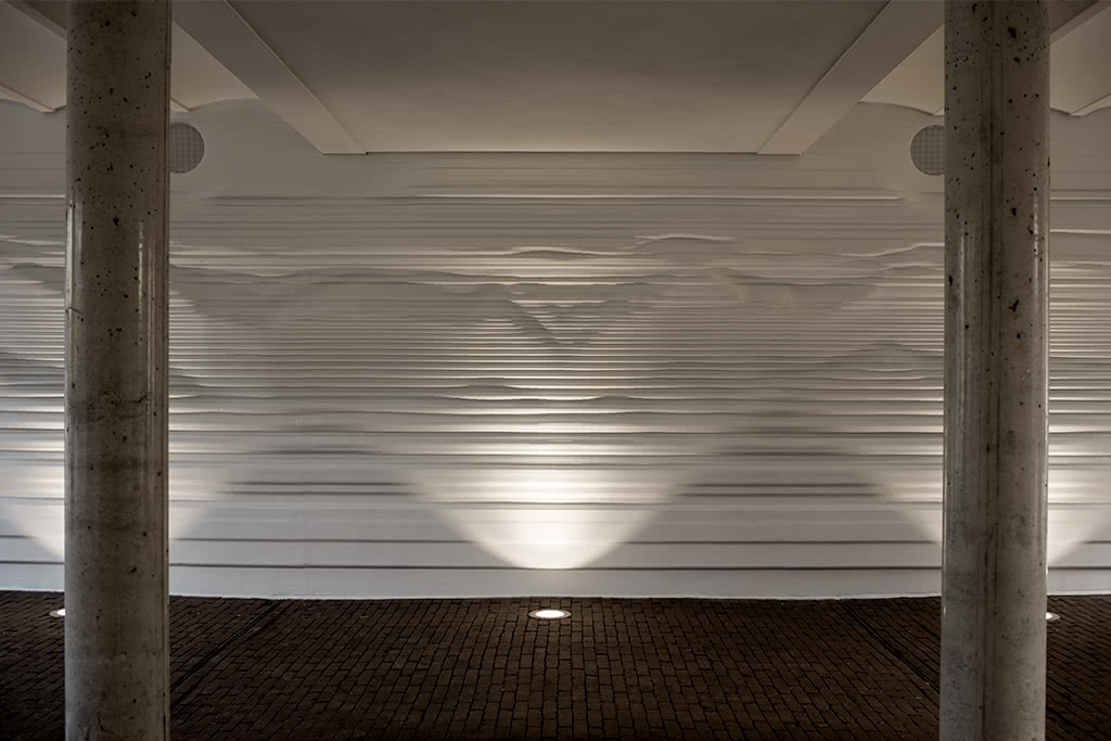 The wall relief has been generated using a spectral analysis (sonogram) of a voice changing from vowel to vowel over time while maintaining a constant pitch. The vowel transitions are composed in such a way as to result in an aesthetical and contrasting visual composition.
